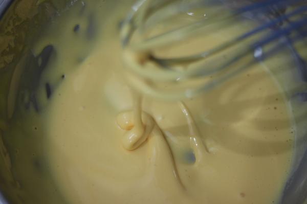 Misture o ovo com a manteiga, até obter um creme bem suave. Acrescente o leite e bata com a batedeira em velocidade média, usando o batedor de massa (aquela pecinha em forma de espiral ou gancho).