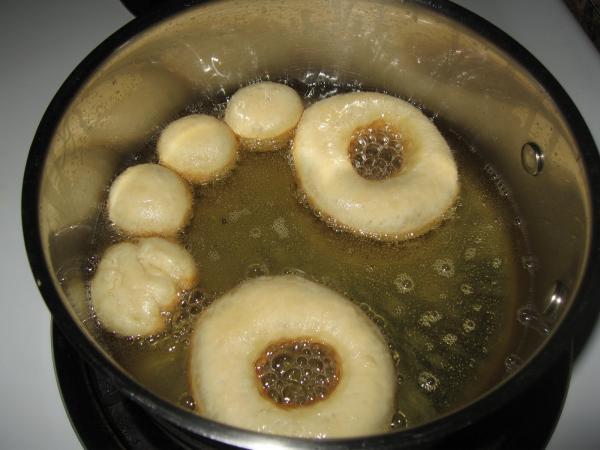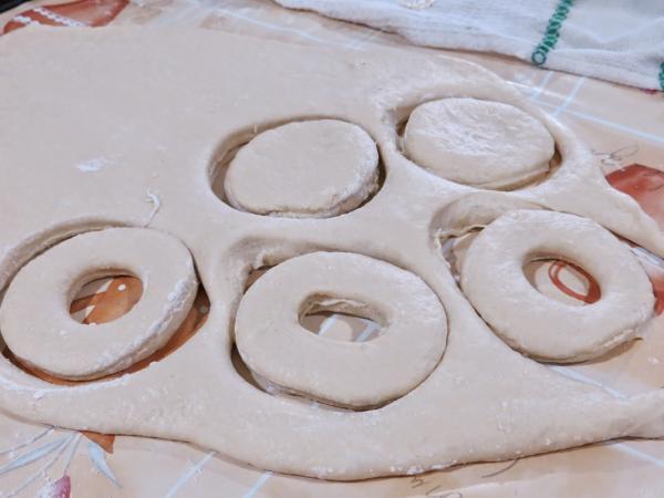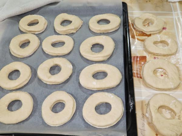 Coloque as rosquinhas e os "buraquinhos do meio" em uma forma com papel manteiga polvilhada com trigo, cubra com um pano e deixe descansar dentro do forno desligado por 1 hora.